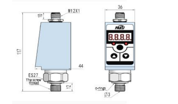 display pressure value and switch status, menu set switch point, analog quantity start, end point, output function, storage function and display function, so the setting does not need to be completed in the field. With high reliability, the output can be directly connected for PLC. M12 lock type connector, easy to disassemble, high protection level. Positive or negative pressure can be measured. The sensor can be used as either a pressure switch or a pressure transmitter because it has both a switching output and an analog output.